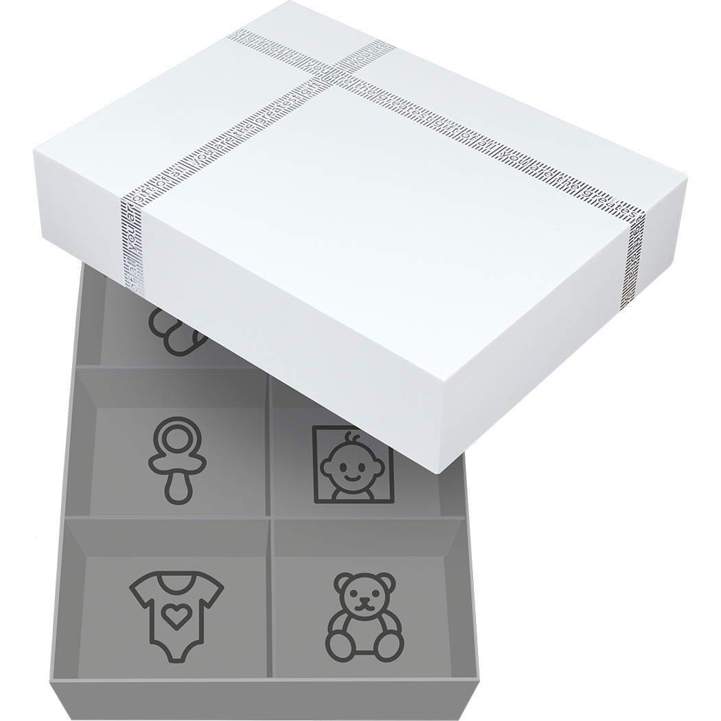 With this set (handprint & photo frame + memorybox) you can create a memory that will last a lifetime. The contemporary white frame offers space for a photo and a hand- or footprint of your little one. The luxurious memory box with silver embossed ribbon offers space for treasured keepsakes such as pacifier, hair lock, tooth, romper etc.. Includes box dividers, hair envelop, tooth box.