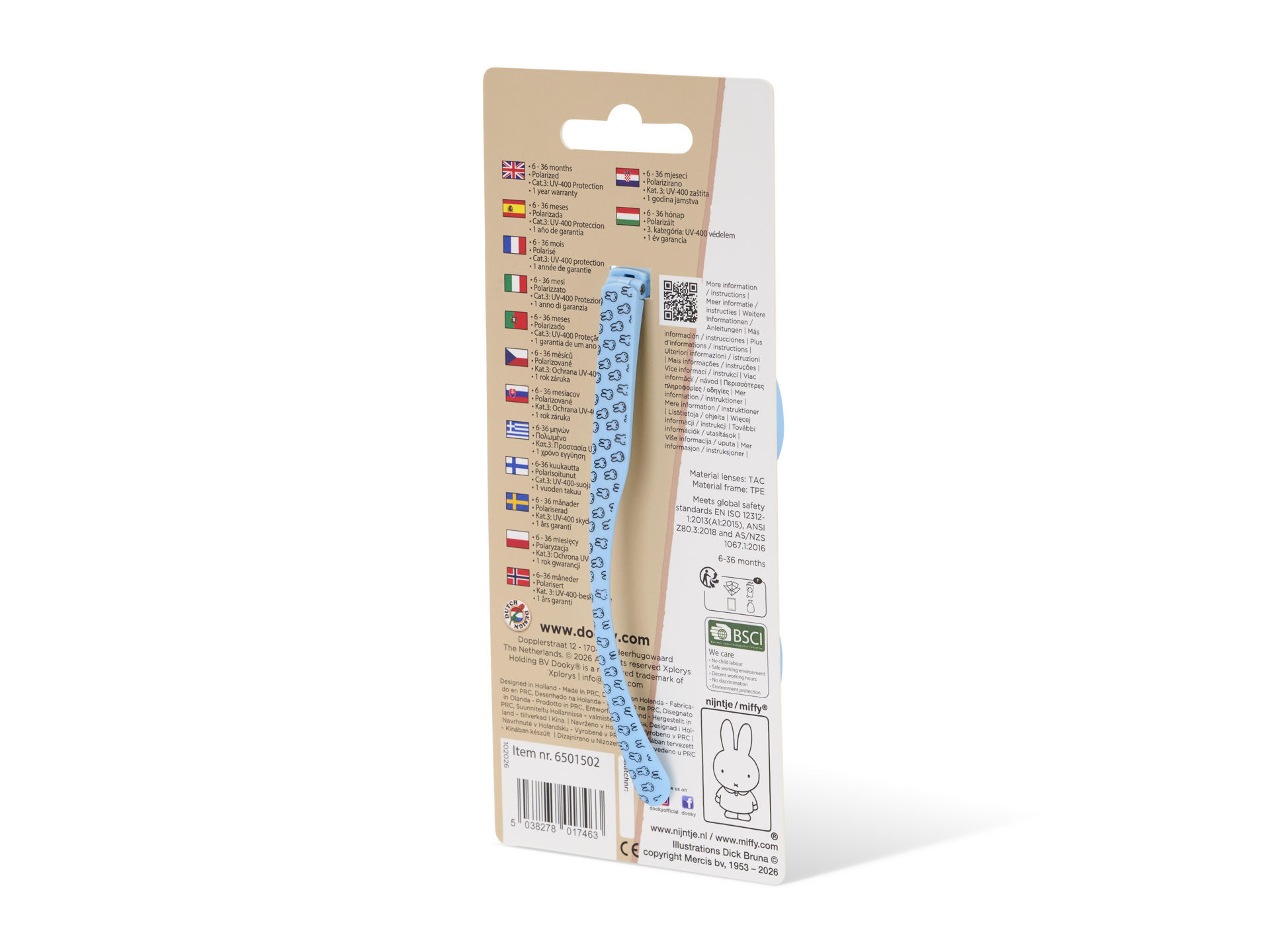 It's time for winter sports or summer holidays again! Wherever you go into the sun, make sure your little one's eyes are protected with good UV-400 protection. These polarized sunglasses offer the necessary protection for children from 6 to 36 months. The lenses are scratch-resistant and anti-reflective, which ensures that the glasses are suitable for many moments. The trendy shape is a stylish option for both winter sports and the beach, so opt for the Dooky Miffy range if you're looking for glasses that combine style and protection. The glasses come in a luxurious pouch. • 6 - 36 months • Polarized lenses • Cat.3: UV-400 protection • Practically unbreakable • 1-year warranty • Luxury pouch included • Scratch-resistant lenses • Anti-reflective • For summer and winter (sports) • Meets global safety standards EN ISO 12312-1:2013(A1:2015), ANSI Z80.3:2018 and AS/NZS 1067.1:2016