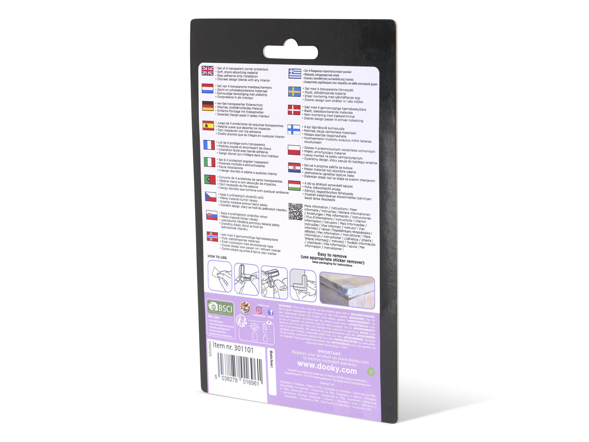 Table edges, cabinets, windowsills they all seem to be designed right at child height. With the Dooky Corner Protectors, you prevent bruises, bumps, and tears. These transparent corner guards are designed to soften sharp edges. Perfect for crawling babies or wobbly toddlers eager to explore. Safety and style combined in one smart solution. Made from soft, flexible material, they effectively absorb impact. Simply attach them to furniture corners using the adhesive strip. Thanks to their transparent design, they remain virtually invisible in your interior. They fit wood, metal, glass, and plastic surfaces and stay firmly in place, even when little hands try to pull them off. Each set includes four protectors, enough for a table or cabinet. You can also use them on low windowsills, sofa corners, or toy chests. Removal is easy and leaves no sticky residue. They are reusable and durable, so you won’t need to replace them frequently. Especially in busy living rooms, kitchens, or playrooms, these protectors are a lifesaver. No more worries when your child stumbles or pulls themselves up on a table leg. A small adjustment that prevents big accidents. Because safe play starts with a safe environment and with these corner protectors, you’re one step closer. • Set of 4 transparent corner protectors • Soft, shock-absorbing material • Easy adhesive strip installation • Discreet design blends with any interior • Reusable and easy to remove without residue • Product Dimensions 4x4.5x2.5 cm.